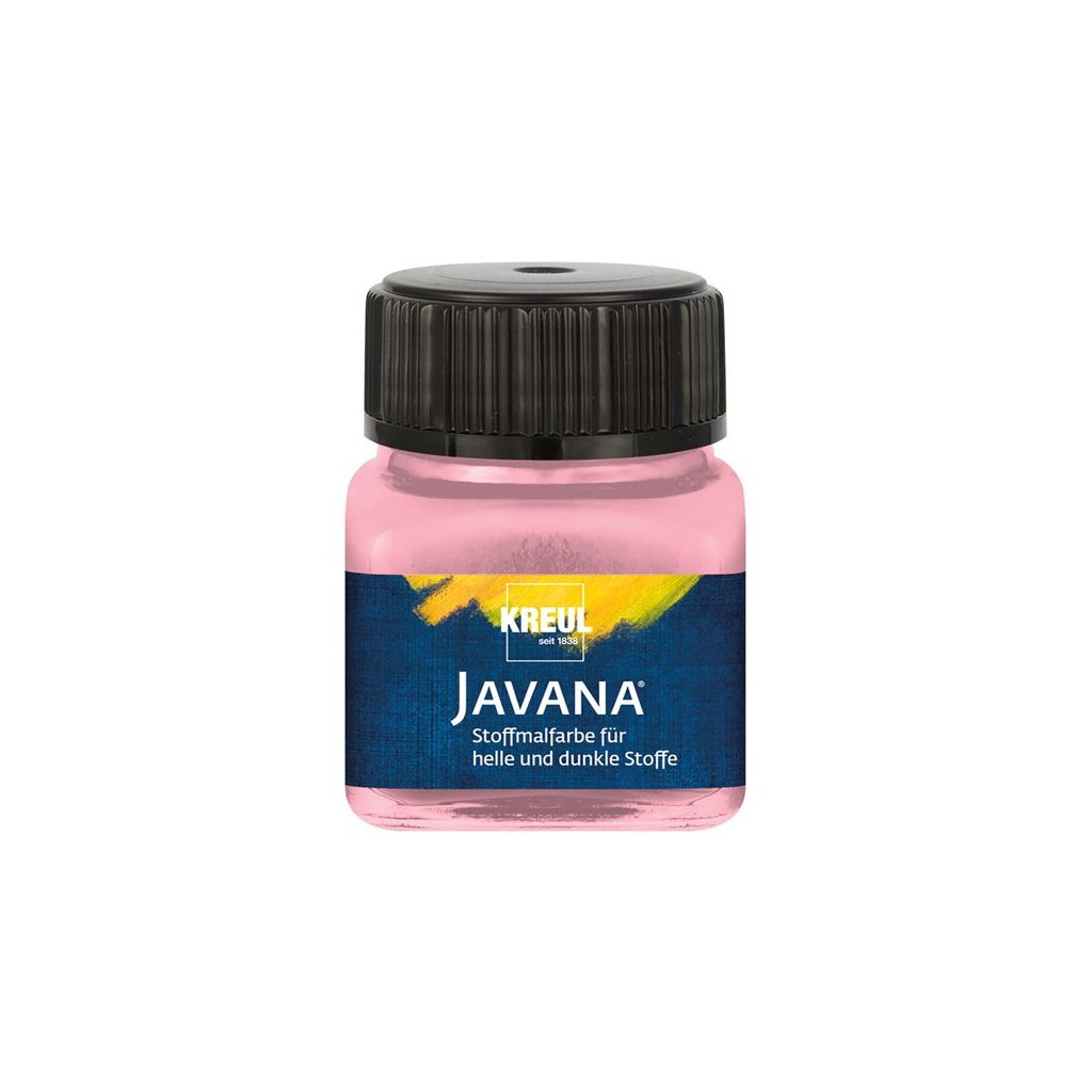 Barva na světlý a tmavý textil JAVANA světle růžová 20ml: lehce tekoucí konzistence, jemná a zvláště živá na světlých tričkách, mikinách, taškách nebo ubrusech, hladké zářivé barvy tkaniny s krémovým charakterem, velmi snadné malování, barva na vodní bázi proniká hluboko do vláken, pro světlé tkaniny z bavlny, viskózy a směsí až o 20% obsah syntetických vláken, vhodná pro tisk nebo ruční malbu, po zafixování odolné proti vyblednutí i vyprání (až do teploty 40°C).