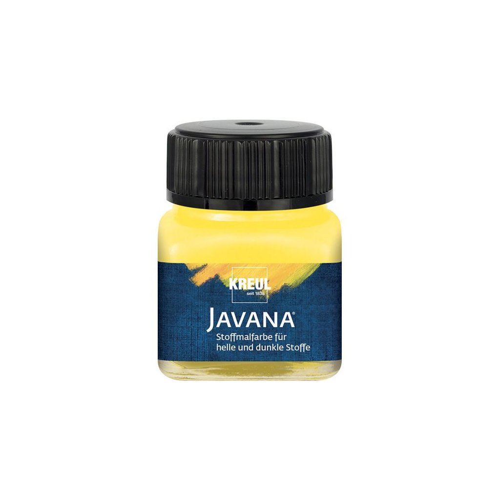 Barva na světlý a tmavý textil JAVANA žlutá 20ml: lehce tekoucí konzistence, jemná a zvláště živá na světlých tričkách, mikinách, taškách nebo ubrusech, hladké zářivé barvy tkaniny s krémovým charakterem, velmi snadné malování, barva na vodní bázi proniká hluboko do vláken, pro světlé tkaniny z bavlny, viskózy a směsí až o 20% obsah syntetických vláken, vhodná pro tisk nebo ruční malbu, po zafixování odolné proti vyblednutí i vyprání (až do teploty 40°C).