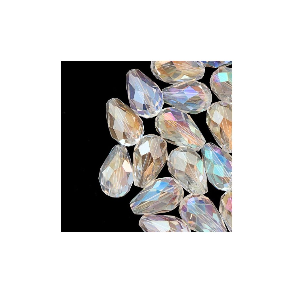 Korálek broušený ve tvaru hrušky o rozměru 19/12mm a barevném provedení crystal AB. Tradiční české broušené kulaté perle (ohňové perle nebo ohňovky), jsou vyráběny broušením na strojích a následným vypálením v peci pro získání vysokého lesku. Korálek je vhodný ná výrobu vánočních ozdob jako andílci a vánoční hvězdy.