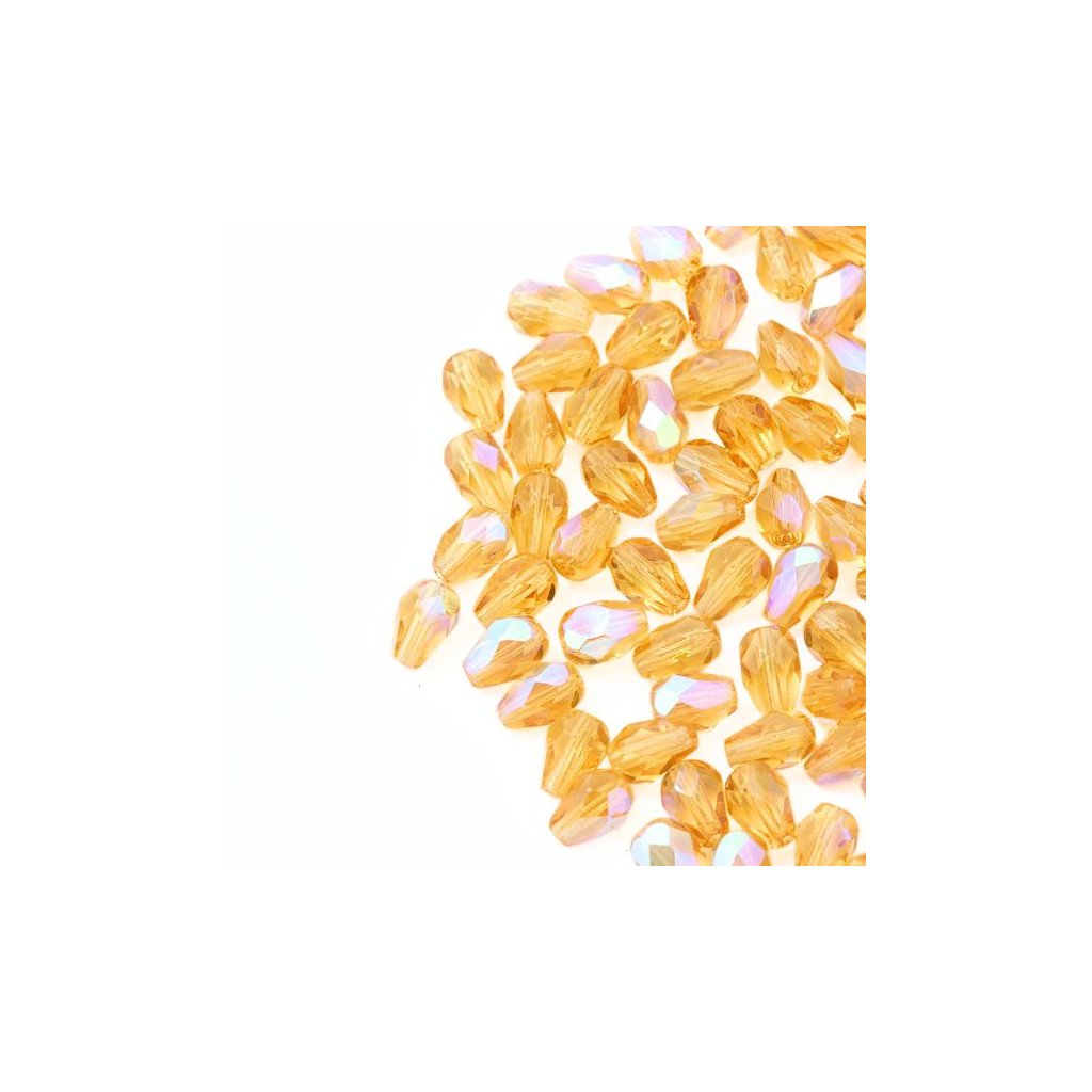Korálek broušený ve tvaru hrušky o rozměru 7/5mm a barevném provedení light topaz AB 10060/28701. Tradiční české broušené tvarové perle (ohňové perle nebo ohňovky), jsou vyráběny broušením na strojích a následným vypálením v peci pro získání vysokého lesku. Korálek je vhodný ná výrobu vánočních ozdob jako andílci a vánoční hvězdy.