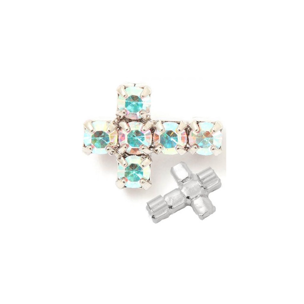Štrasový korálek ve tvaru křížku o rozměru 10/7mm. Křížek má barvu kamenů crystal AB a povrchovou úpravu rhodium. Křížek má na zadní straně dvě průvlekové trubičky, aby se korálek netočil a krásně držel. Tento křížek se především hodí na náramky jako mezidílek mezi korálky.