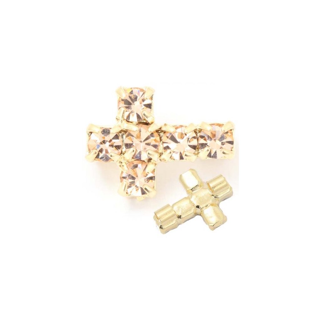 Štrasový korálek ve tvaru křížku o rozměru 10/7mm. Křížek má barvu kamenů light peach a povrchovou úpravu gold plating 24kt. Křížek má na zadní straně dvě průvlekové trubičky, aby se korálek netočil a krásně držel. Tento křížek se především hodí na náramky jako mezidílek mezi korálky.