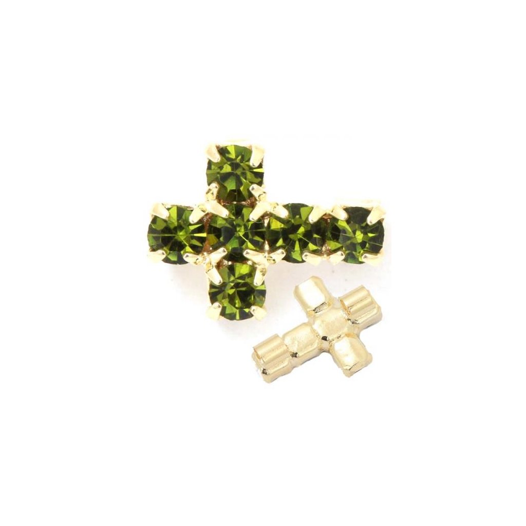 Štrasový korálek ve tvaru křížku o rozměru 10/7mm. Křížek má barvu kamenů olivine a povrchovou úpravu gold plating 24kt. Křížek má na zadní straně dvě průvlekové trubičky, aby se korálek netočil a krásně držel. Tento křížek se především hodí na náramky jako mezidílek mezi korálky.