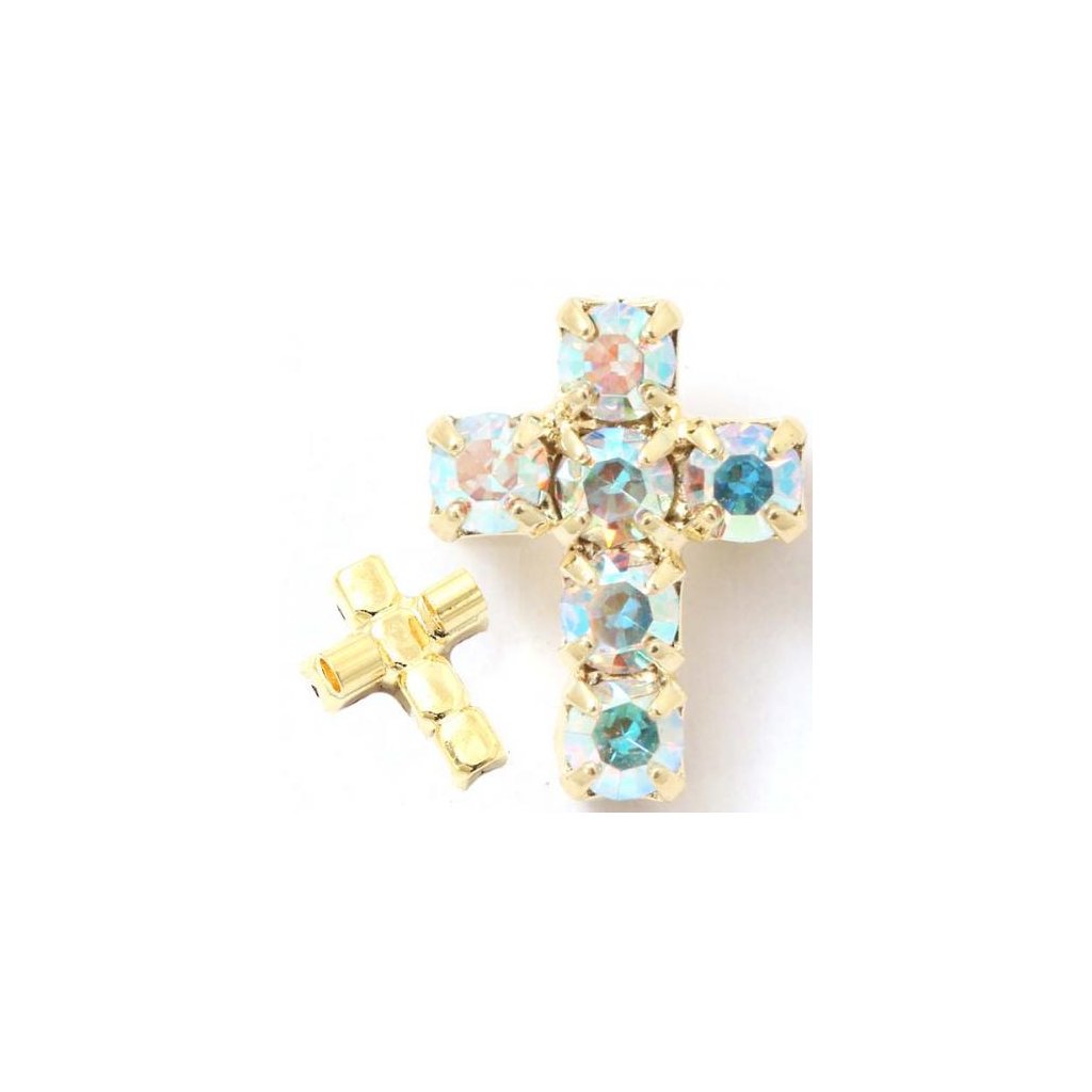 Štrasový korálek ve tvaru křížku o rozměru 10/7mm. Křížek má barvu kamenů crystal AB a povrchovou úpravu gold plating 24kt. Křížek má na zadní straně dvě průvlekové trubičky, aby se korálek netočil a krásně držel. Tento křížek se především hodí na náramky jako mezidílek mezi korálky.