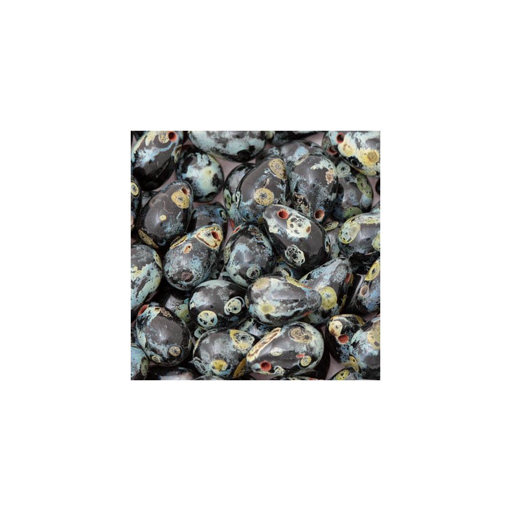 Korálek ve tvaru kapky v barevném provedení černá s úpravou travertín o rozměru 9/6mm. Balení obsahuje jeden kus.