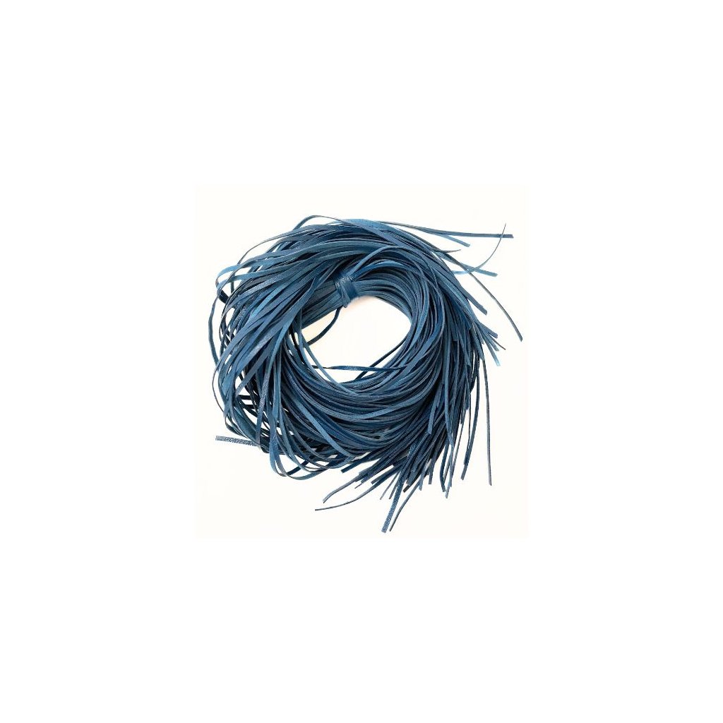 Plochá kůže o rozměru cca 2x1,5mm a barevném provedení modrá. Řemínek má délku 90cm a lze zněj udělat náramek či náhrdelník pro přívěsek.