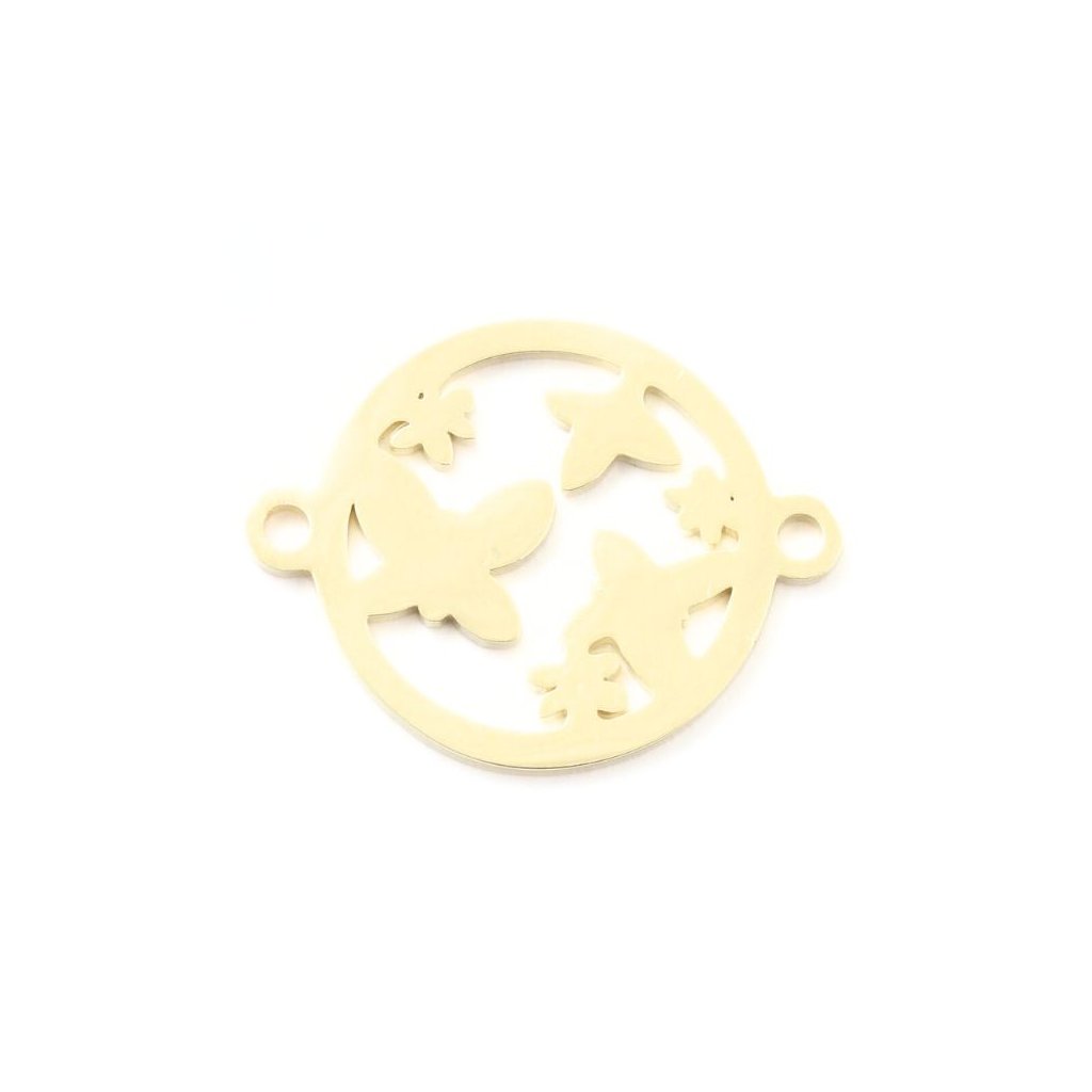 Mezidíl ve tvaru kruhu s motivem motýlků o rozměru 20/16mm. Mezidílek je vyroben z chirurgické oceli s povrchovou úpravou gold plating 24kt. Je vhodný především jako mezidílek na náramky.