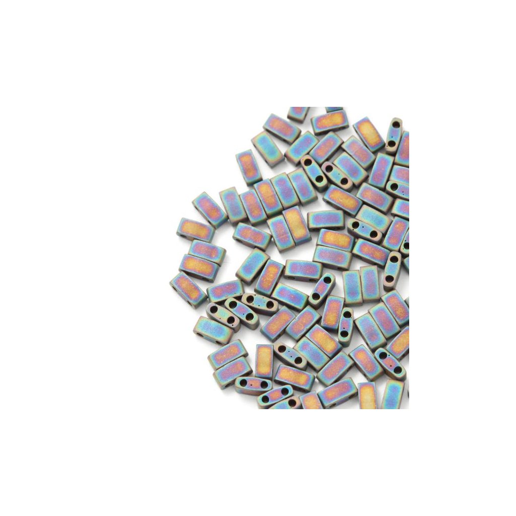 Poloviční Miyuki Tila korálky jsou obdélníkové korálky se 2 dírkami rovnoběžnými dírkami. Velikost je 2,5 x 5 mm, což je přesně polovina velikosti čtvercových korálků tila. S tloušťkou pouhých 2 mm jsou velmi ploché.