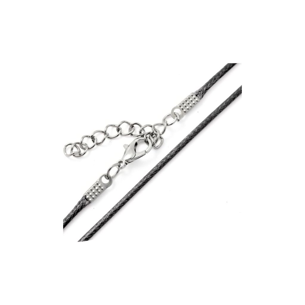 Náhrdelníkový komponent z voskované šňůrky o síle 1,5mm a délce 43cm a barevném provedení černá. Náhrdelník je včetě koncovek a karabinky a prodlužovacího řetízku, jedná se tak o kompletní náhradelník a stačí již jen vybrat nějaký přívěsek k zavěšení.