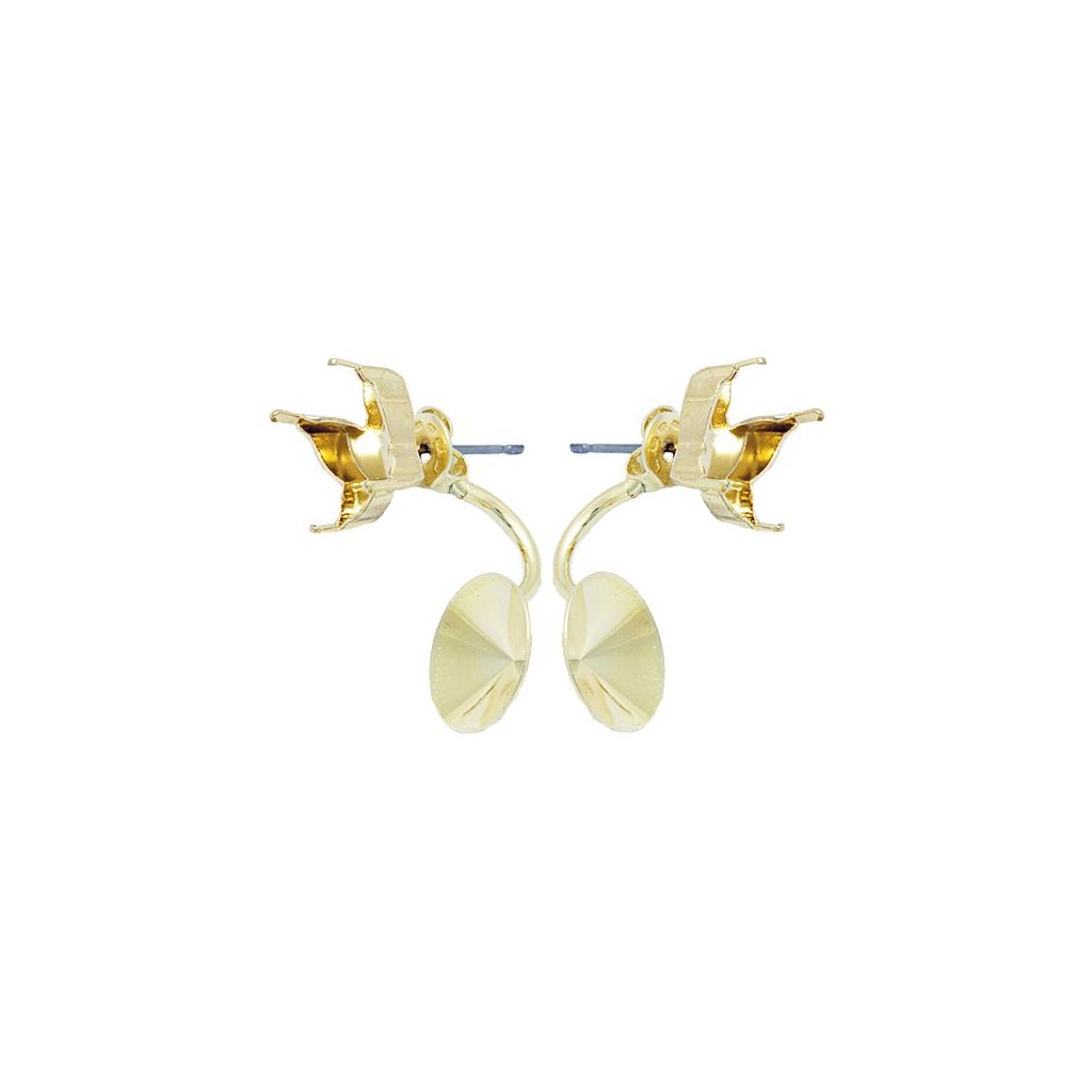 Náušnice na dříku Double, jsou určeny pro Swarovski Butterfly 10mm. Motýlek náušnic je opratřen závěsem pro Rivolu 12mm, díky tomuto efektu je tak krystal s předního pohledu pod uchem. Kámen se usazuje pomocí krapen, nemusí se tak již lepit. Náušnice mají velmi kvalitní galvanizaci Gold Plating 24kt. Uvedená cena je za jeden pár.