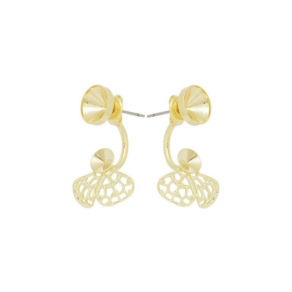 Náušnice na dříku Double, jsou určeny pro Swarovski či Preciosa Chaton 8mm. Motýlek náušnic je opratřen závěsem s filigránem pro Swarovski či Preciosa Rivoli 6mm, díky tomuto efektu je tak rivolka s předního pohledu pod uchem. Náušnice mají velmi kvalitní galvanizaci Gold Plating 24kt. Uvedená cena je za jeden pár.