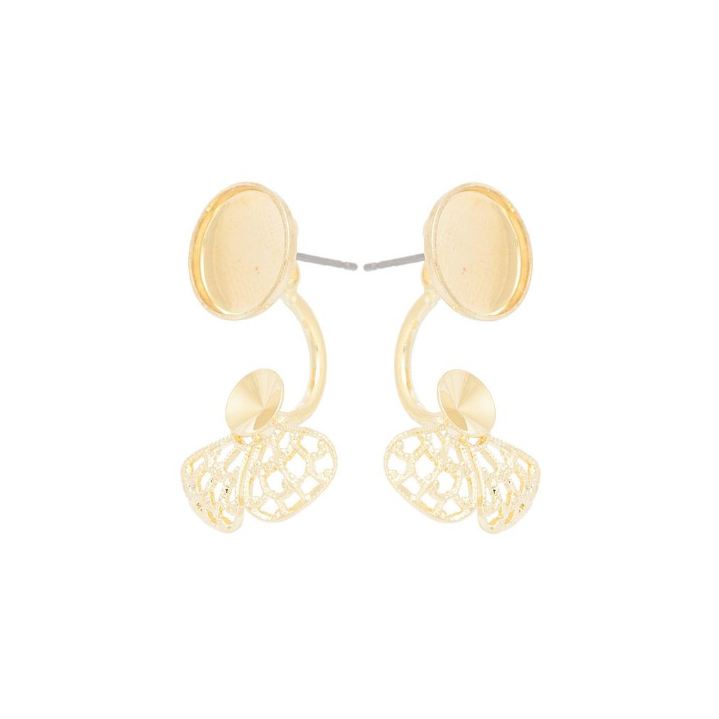 Náušnice na dříku Double, jsou určeny pro Swarovski či Preciosa Chess kruh 10mm. Motýlek náušnic je opratřen závěsem s filigránem pro Swarovski či Preciosa Rivoli 6mm, díky tomuto efektu je tak rivolka s předního pohledu pod uchem. Náušnice mají velmi kvalitní galvanizaci Gold Plating 24kt. Uvedená cena je za jeden pár.