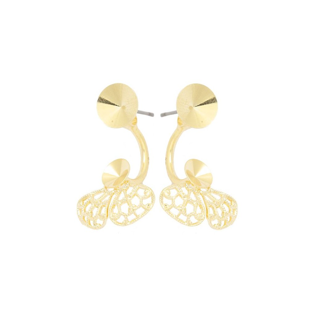 Náušnice na dříku Double, jsou určeny pro Swarovski či Preciosa Rivoli 6mm. Motýlek náušnic je opratřen závěsem s filigránem pro Swarovski či Preciosa Rivoli 6mm, díky tomuto efektu je tak rivolka s předního pohledu pod uchem. Náušnice mají velmi kvalitní galvanizaci Gold Plating 24kt. Uvedená cena je za jeden pár.