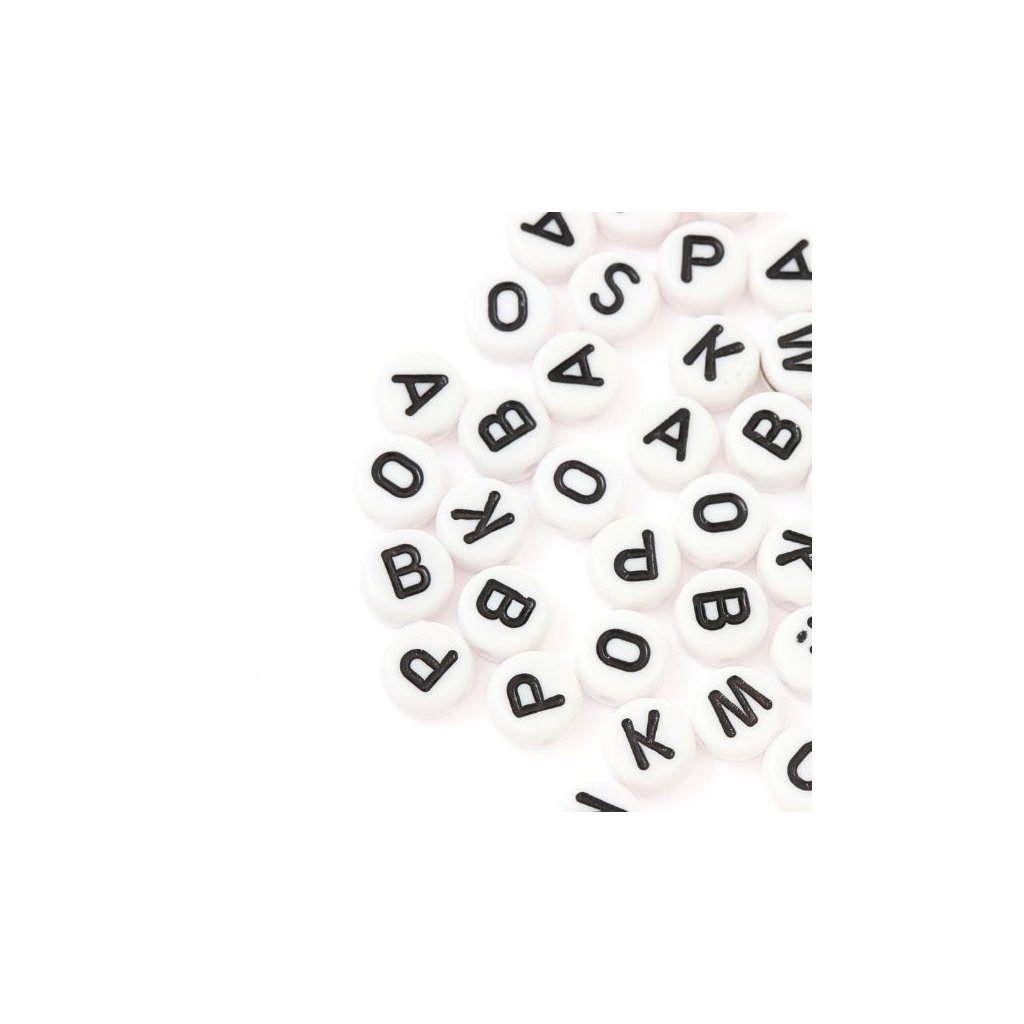 Plastový korálek ve tvaru kruhu s písmenkem. Korálek má rozměr 7/4mm a barevné provedení bílá s čeným písmenkem. Sestavte si jméno, název či motivaci a navlečte například na náramek.