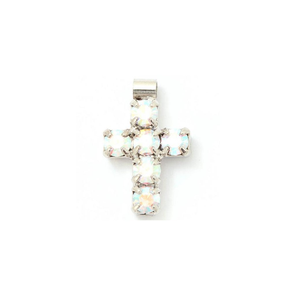 Malý křížek ze štrasu o rozměru 10/7mm, barva krystalů crystal AB a povrchová úprava rhodium. Křížek má na vrchní straně trubičku s průtahem 1,8mm. Lze jej tak navléce jako korálek mezi korálky či přívěsek.