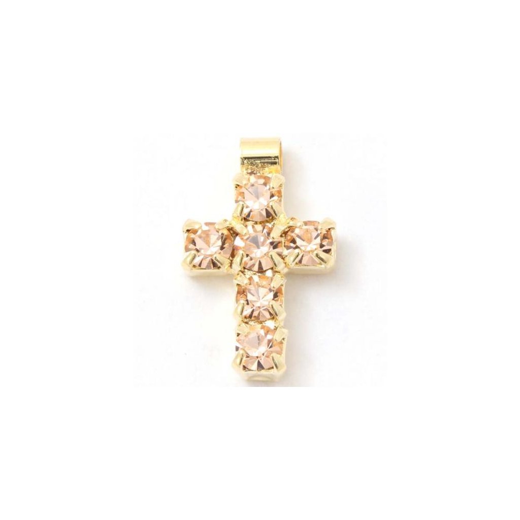 Malý křížek ze štrasu o rozměru 10/7mm, barva krystalů light peach a povrchová úprava gold plating 24kt. Křížek má na vrchní straně trubičku s průtahem 1,8mm. Lze jej tak navléce jako korálek mezi korálky či přívěsek.
