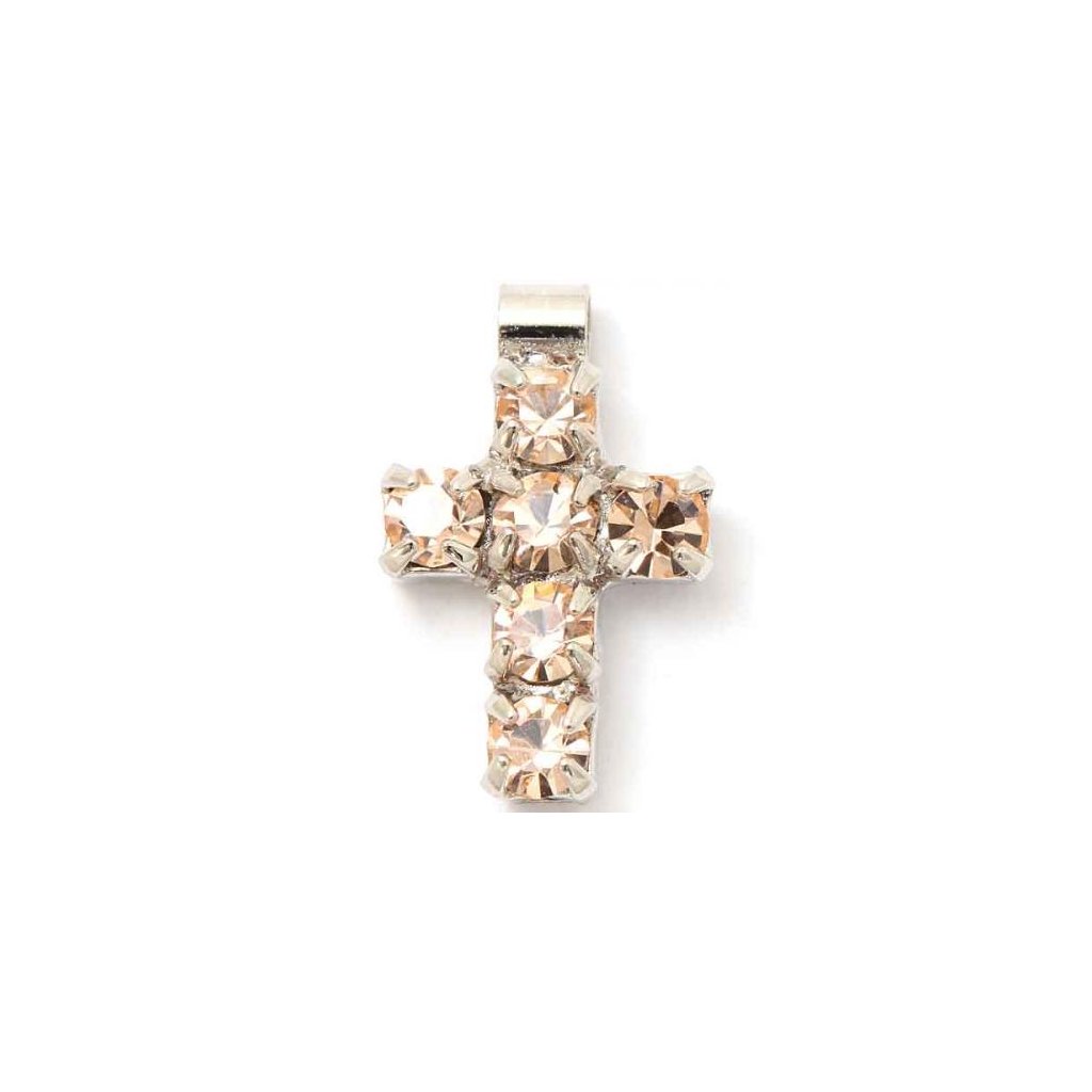 Malý křížek ze štrasu o rozměru 10/7mm, barva krystalů light peach a povrchová úprava rhodium. Křížek má na vrchní straně trubičku s průtahem 1,8mm. Lze jej tak navléce jako korálek mezi korálky či přívěsek.