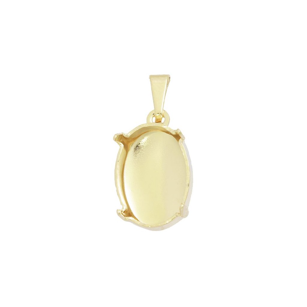 Přívěsek je určen pro krystal Swarovski 4120 Oval o rozměru 14/10mm. Lůžko má krapnový systém pro uzavření kamene bez lepení. Přívěsek má kvalitní povrchovou úpravu Gold Plating 24kt. Uvedená cena za jeden kus.