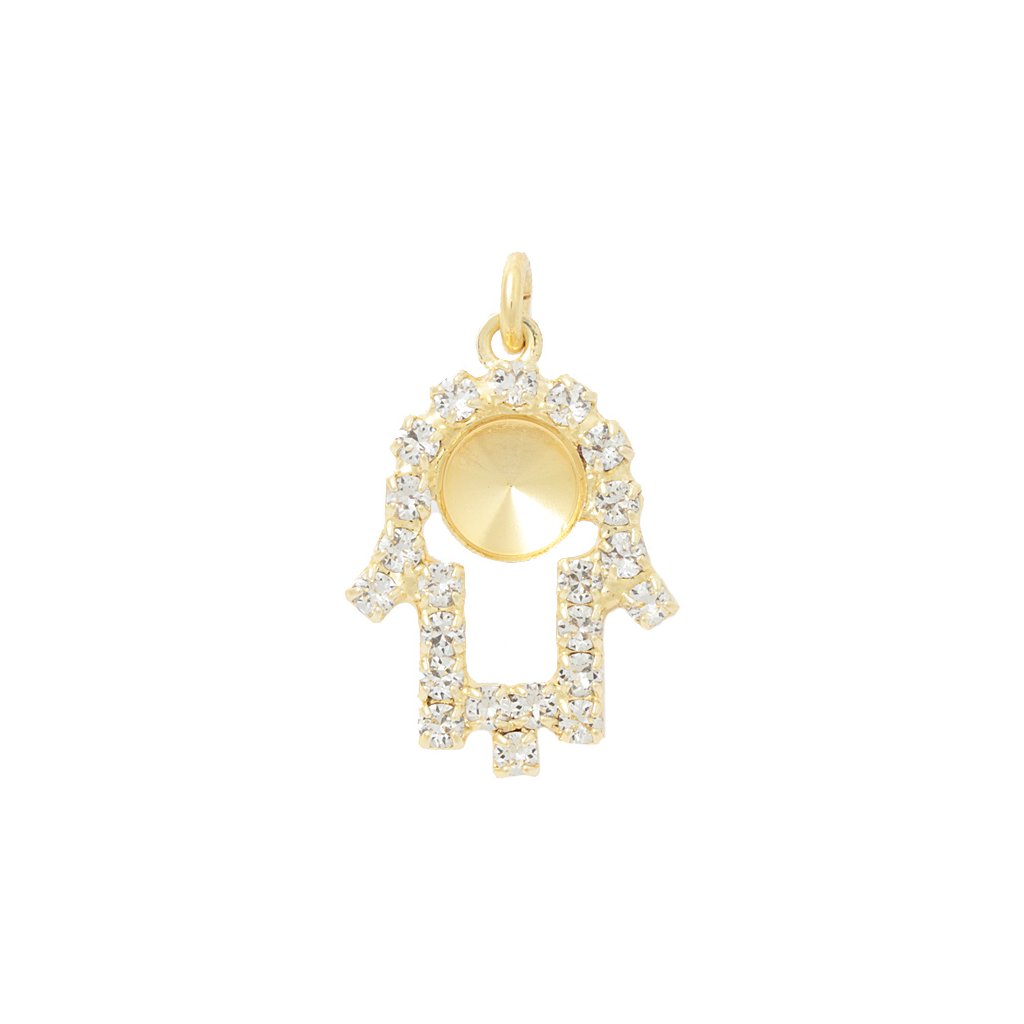 Přívěsek s kroužkem Ruka Fatima je určen pro krystal Swarovski či Preciosa Rivoli o rozměru 6mm. Kroužek slouží k zavěšení na řetízek či náramek. Krystal se do přívěsku lepí pomocí lepidla na kov/sklo. Přívěsek má kvalitní povrchovou úpravu gold plating 24kt.