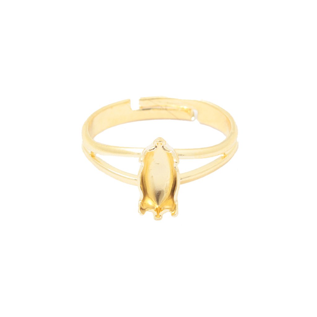 Prsten s lůžkem pro krystal Swarovski Naveta 4228 o rozměru 10/5mm. Kamínek se do prstenu nelepí, ale používají se krapny k jednoduchému usazení a upevnění. Prsten má kvalitní povrchovou úpravu gold plating 24kt.