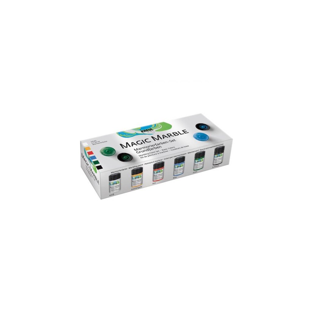 S našimi mramorovacími barvami mohou být vaše módní bytové doplňky barevnější, originálnější a svěžejší . Ať už na dřevěných bednách, obrázcích, svíčkách nebo porcelánu. Kouzlo mramoru udělá každou vaší dekoraci výraznější. Hladké plochy jako sklo, kov, umělá hmota odmastíme. Při nakapávání barev vždy počítejte, že druhá barva potlačí první barvu a je rovněž intenzivnější. Pro jednobarevné mramorování použijeme kombinaci bezbarvé barvy a žádané barvy. Barvy jsou vzájemně míchatelné a lze docílit další odstíny barev jejich mícháním. Při mramorování postupujte rychleji, aby se zabránilo vzniku barevného filmu. Originální barevné tóny je možno docílit pouze na bíly´ch předmětech, na jiny´ch materiálech jako dřevu je barva částečně tmavší. Při mramorování textilu je vhodné udělat nejdříve zkušební testy. Po použití lahvičku vždy uzavřeme. SADA OBSAHUJE: 6 x 20 ml Mramorovací barvy Magic Marble – bílá, sluneční žlutá, červená, modrá, zelená, černá, instrukce