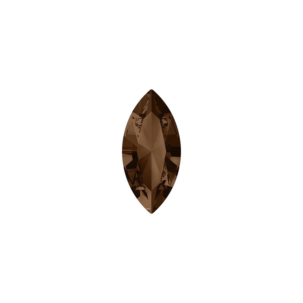 Tvarový krystal Swarovski Navette 4228 o rozměru 10/5mm a barevném provedení Smoked Topaz F. Krystal je vhodný pro lepení a usazování do lůžek, polymerových hmot, či obšívání.