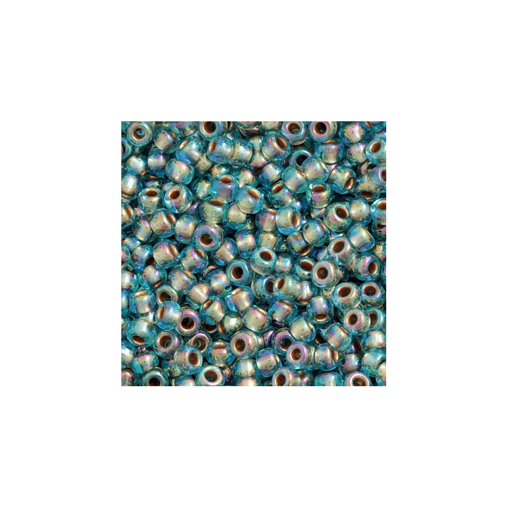 TOHO Round o rozměru 11/0 (2,2mm) a barevném provedení Gold Lined Rainbow Aqua. Dokonale tvarově pravidelný japonský rokajl od firmy TOHO Co., Ltd. Díky většímu průměru průtahu je vhodný na obšívání a vyšívání. Cena za balení 10g (cca 1000ks).