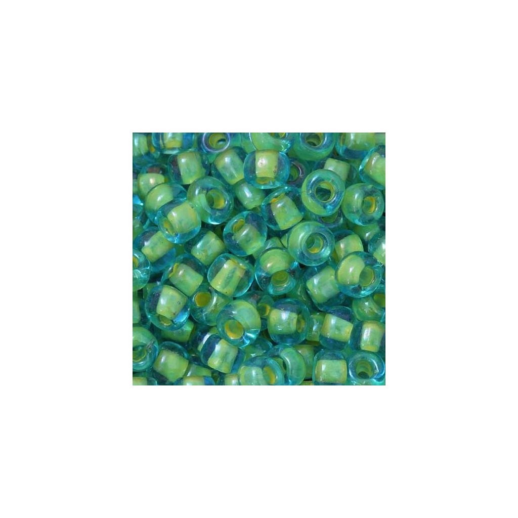 TOHO Round o rozměru 6/0 (4mm) a barevném provedení Aqua/TOHO Opaque Yello Lined. Dokonale tvarově pravidelný japonský rokajl od firmy TOHO Co., Ltd. Díky většímu průměru průtahu je vhodný na obšívání a vyšívání.