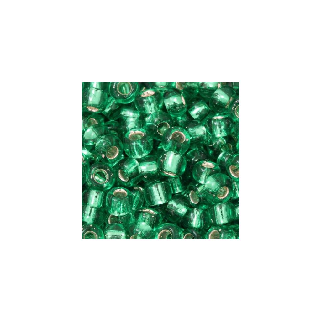 TOHO Round o rozměru 6/0 (4mm) a barevném provedení Silver/Dark Peridot Lined. Dokonale tvarově pravidelný japonský rokajl od firmy TOHO Co., Ltd. Díky většímu průměru průtahu je vhodný na obšívání a vyšívání.