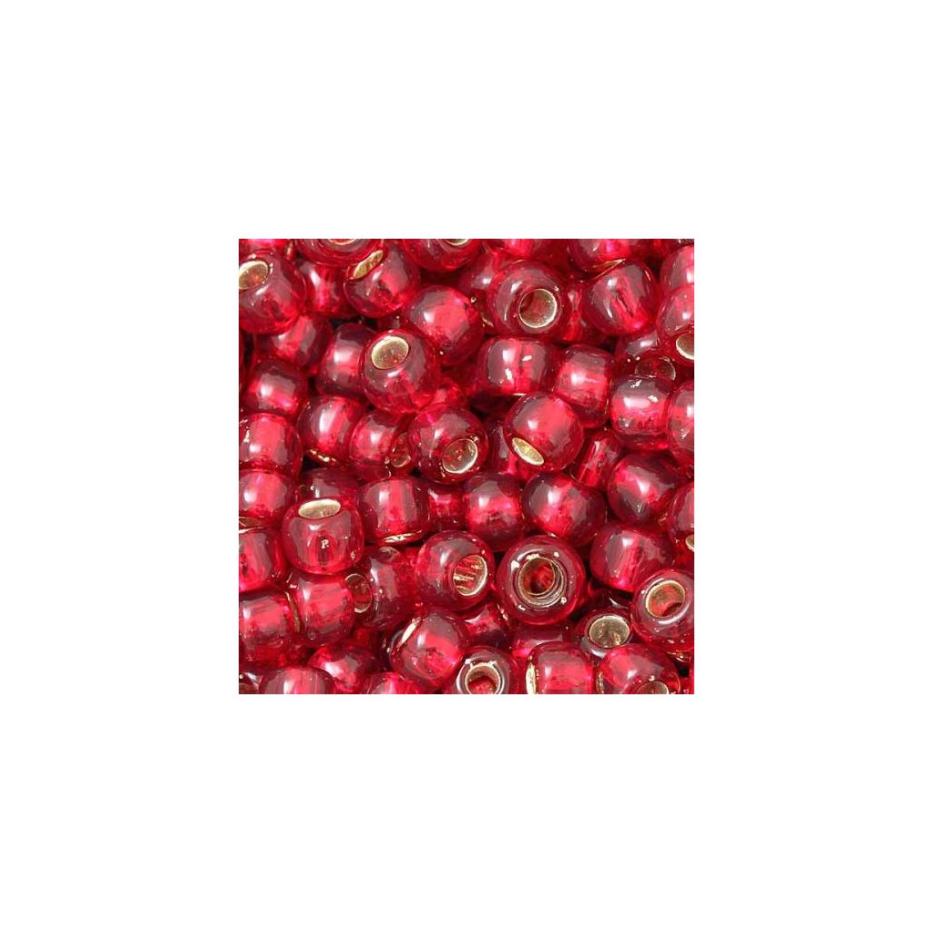 TOHO Round o rozměru 6/0 (4mm) a barevném provedení Silver/Garnet Lined. Dokonale tvarově pravidelný japonský rokajl od firmy TOHO Co., Ltd. Díky většímu průměru průtahu je vhodný na obšívání a vyšívání.