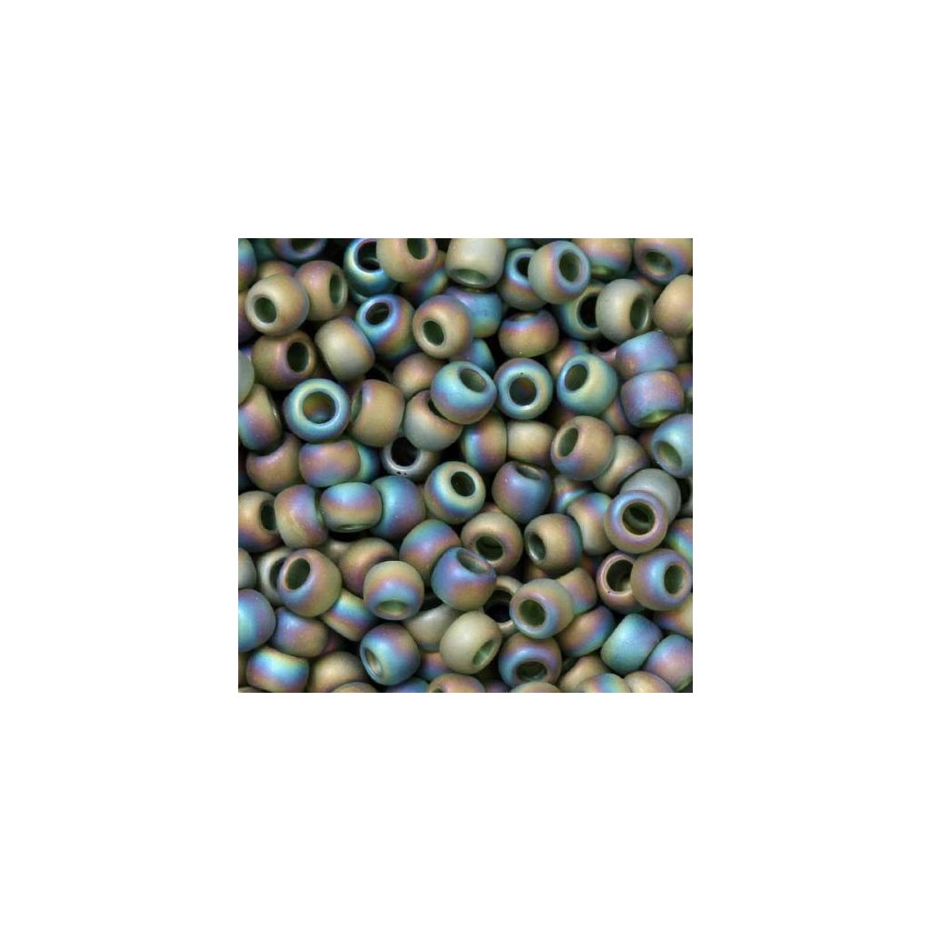 TOHO Round o rozměru 8/0 (3,1mm) a barevném provedení Rainbow Frosted Olivine. Dokonale tvarově pravidelný japonský rokajl od firmy TOHO Co., Ltd. Díky většímu průměru průtahu je vhodný na obšívání a vyšívání.