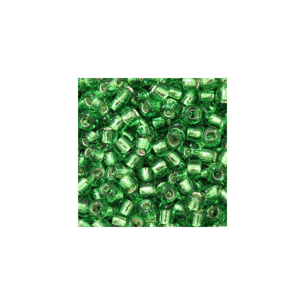 TOHO Round o rozměru 8/0 (3,1mm) a barevném provedení Silver/Peridot Lined. Dokonale tvarově pravidelný japonský rokajl od firmy TOHO Co., Ltd. Díky většímu průměru průtahu je vhodný na obšívání a vyšívání.