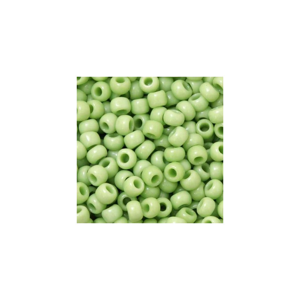 TOHO Round o rozměru 8/0 (3,1mm) a barevném provedení Sour Apple. Dokonale tvarově pravidelný japonský rokajl od firmy TOHO Co., Ltd. Díky většímu průměru průtahu je vhodný na obšívání a vyšívání.